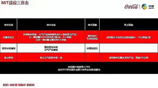 据悉,2021 年 9 月份可口可乐展开 “蒙战元气” 为主题的对战计划,其中显示有 “自有冰柜清除元气产品”、“抢占元气冰柜”、“陈列包裹夹击” 等战略措施。