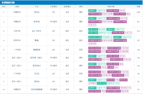 进入5月份,有关宝马汽车的投诉情况进一步恶化。据车质网的统计数据,5月1日-5月30日,宝马X3的投诉量已高达1380起,位居投诉排行榜首位。紧随其后的宝马5系,投诉量也超过800起。而更为严重的是,投诉排行榜前十中,宝马车型就占据了六个“席位”。
