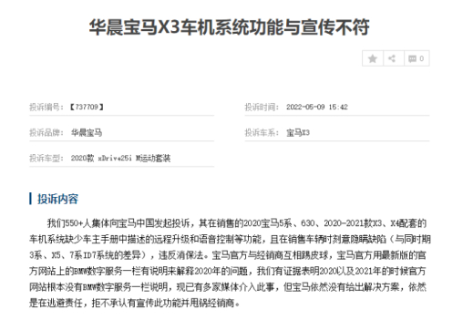 今年临近3·15时期,宝马5系所配套的ID7系统OTA升级功能缺失,遭到百位车主联名投诉。投诉原因为宝马在销售的2020宝马5系、630、2020-2021款X3、X4配套的车机系统,缺少车主手册中描述的远程升级和语音控制等功能,且在销售车辆时刻意隐瞒缺陷。