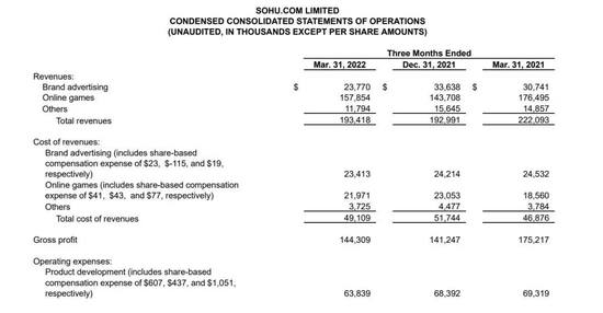 财报显示,搜狐一季度总收入为1.93亿美元。其中,品牌广告收入为2400万美元,在线游戏收入为1.58亿美元。归于搜狐公司的非美国通用会计准则净利润为900万美元。