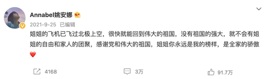 上一次引起全网关注,还是去年9月份其姐姐孟晚舟回国。当时,作为妹妹的姚安娜发布了一条微博,里面写道“姐姐你永远是我的榜样,是全家的骄傲”。这条微博点赞量超过90万,评论3万多条。