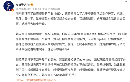 其发布的音乐《信》,更是遭到了乐评人的质疑。微博认证为音乐博主的@real干大滋发文称,《信》这首歌集合了几乎华语最顶级制作阵容,姚谦、陈伟、黄中平,但是这首歌特别像一场科技展示,基本看不到任何鲜活的气息,她(姚安娜)都保持着一个表情,没有任何感情的念词,“难以想象修音师经历了什么。”