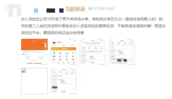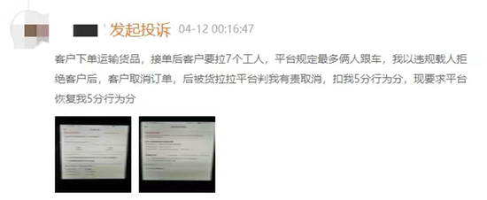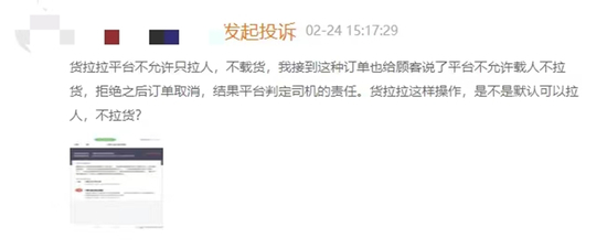 然而,并非所有货运司机都愿意“载人”,部分货运司机也表示“苦货拉拉久矣”。法治网研究院发现,在黑猫投诉平台中,有不少货运司机投诉货拉拉。多位司机声称,接单后客户提出无货载人或者多人跟车,但货拉拉规定不能无货载人,载货时最多可以允许两名客户跟车。司机以不能违规载人拒绝客户后,平台却扣除其5分行为分。还有司机投诉称,“加入货拉拉公司10天做了两千来块流水单,做的流水有五分之一是违法违规载人的!”