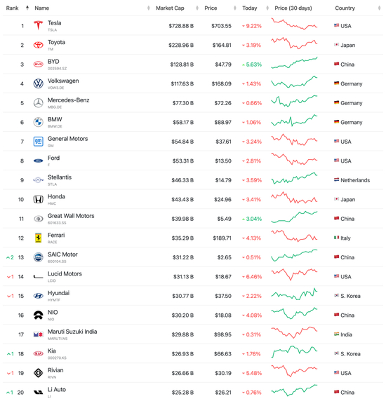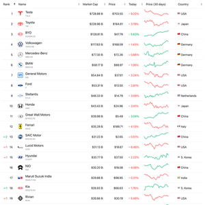 据最新全球车企市值排行榜显示,特斯拉仍是全球市值第一车企,以7289.8亿美元遥遥领先其它车企。丰田集团紧随其后排名第二,总市值为2289.6亿美元,仅为特斯拉市值的30%。排名第三的是比亚迪,总市值为1288.1亿美元,反超大众集团,也是前十排行榜中唯一一家中国车企。此外,第四至十名分别为大众集团、梅赛德斯-奔驰、宝马集团、通用汽车、福特汽车、Stellantis集团、本田汽车。