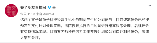 对此,“交个朋友直播间”回应称,这是锤子科技经营手机业务期间产生的公司债务,目前该笔债务已经按预定的支付计划处理完毕,法院恢复执行的目的是进行结案程序处理。6日下午,罗永浩本人也通过微博表示:“这笔债务已经支付完了,法院恢复执行是为了结案程序。每还一笔钱,都会害得亲友们担心一次。”
