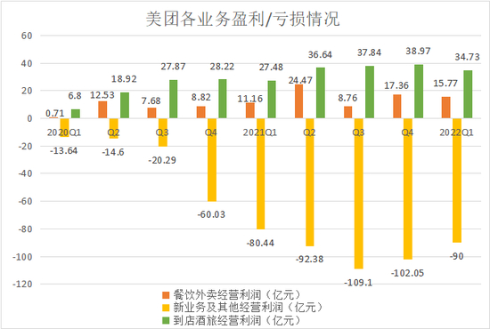 最新财报显示,2022年第一季度,美团“新业务及其他”营收145亿元,同比增长47%;经营亏损继续收窄至90亿元,经营亏损率降至62.3%。
