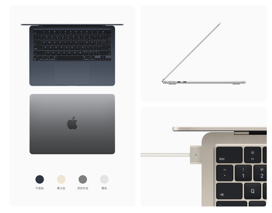 话说回来,这次的新 Air 取消了原本的楔形外观,色彩在原本的基础上又增加了一款 “ 午夜色 ”。