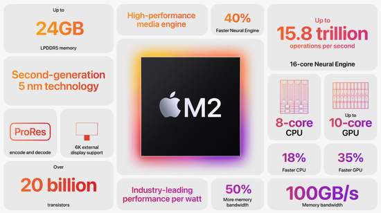 虽然 M2 比起 M1 来说内存最高提升到了 24G ,缓存更大,内存带宽也增强了不少。