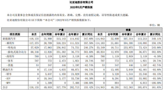 比亚迪今年5月产销快报