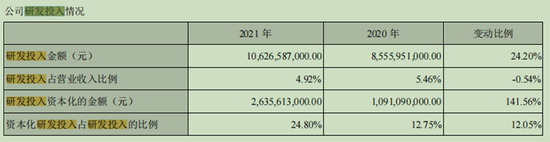 2021年,比亚迪研发投入为106.27亿元,同比增长24.20%。比亚迪副总裁、财务总监周亚琳此前介绍,公司2021年研发投入同比上升,资本化金额增加,主要是对新车型和项目的开发投入增加所致。