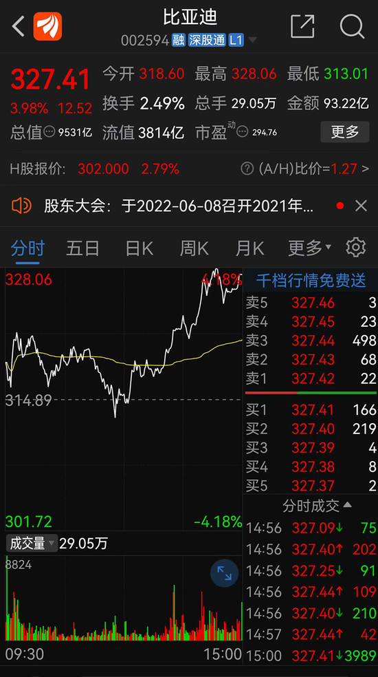 6月8日,比亚迪盘中创新高,达328.06元/股,当日收盘总市值9531亿元,距离1万亿元市值仅一步之遥。
