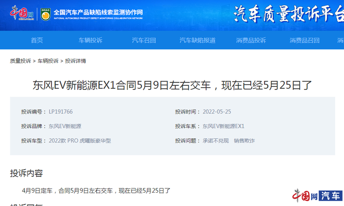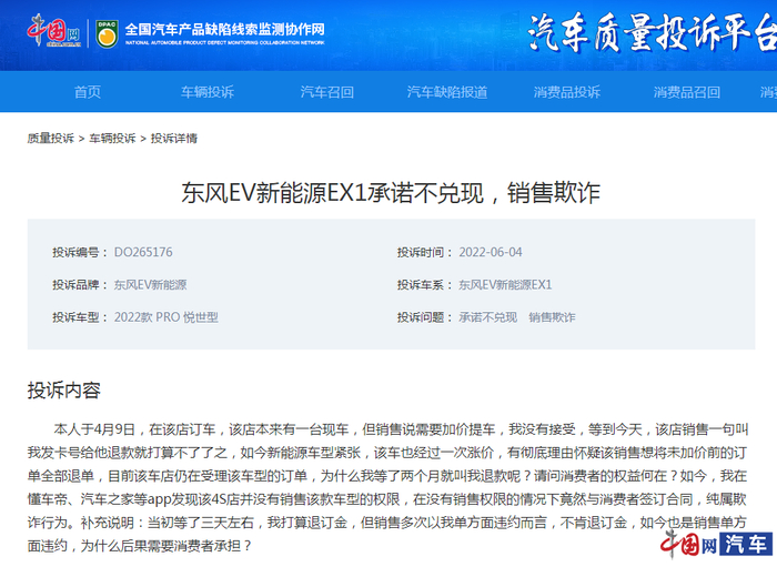 中国网汽车6月9日讯 (记者 王忆东)近些年,国内城市交通拥堵、停车难、油费高等问题愈发突显,而伴随着补贴退出,经济环保、便捷实用的小型电动乘用车备受消费者关注。然而近日,中国网汽车质量投诉平台则接到了一位东风EV新能源EX1 PRO车主对品牌承诺不兑现、销售欺诈的投诉。