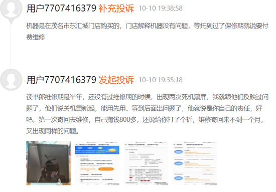 在黑猫投诉上,对读书郎售后乱收费、无响应的投诉尤其多。有网友爆料,购买的读书郎平板还没过保修期,就出现两次黑屏死机,但商家一直拖延维修。等过了保修期,就让买家自己付钱退回原厂,维修不到一个月又出现同样的问题。