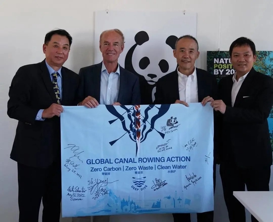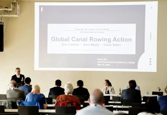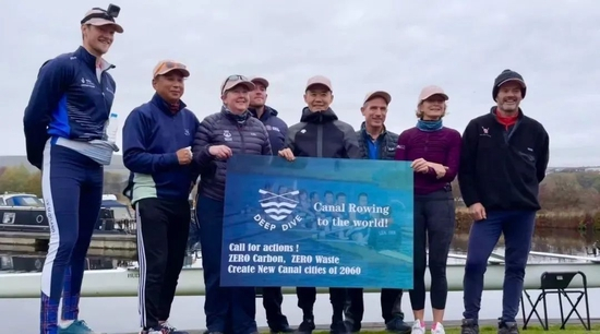 在此,我诚挚邀请IWI(注:Inland Waterways International,内河航道国际组织,世界运河大会主办方)加入这个计划和倡议。这次来参加世界运河大会,我特别准备了一组全球运河赛艇穿越行动的旗帜,倡导“Zero Carbon, Zero Waste, Clean Water“的绿色生活方式,我真诚地邀请WCC各位参会代表共同签名,在联合国气候大会上,发出属于运河城市的和声。