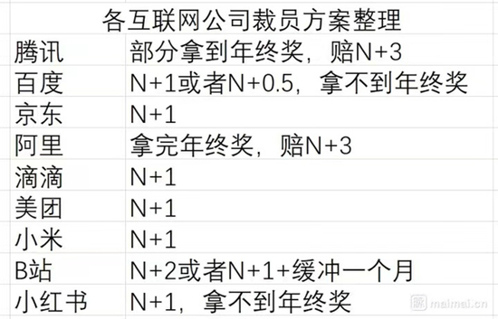 该员工还晒出一份“各互联网公司裁员方案整理”的表格,根据该表,相比其它几家大厂,阿里的“拿完年终奖,赔N+3”方案如该员工所说“还算良心”。