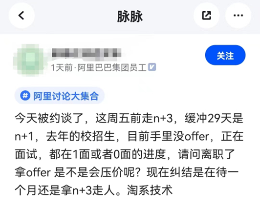 有阿里员工发文称,“今天被约谈了,这周五走N+3,缓冲29天是N+1,去年的校招生,目前手里没offer,正在面试”。该员工还纠结是再待一个月还是拿n+3走人。还有员工发文证实阿里裁员N+3,并称和之前流传消息不同的是,最后期限提前到周三以及没有次月社保。