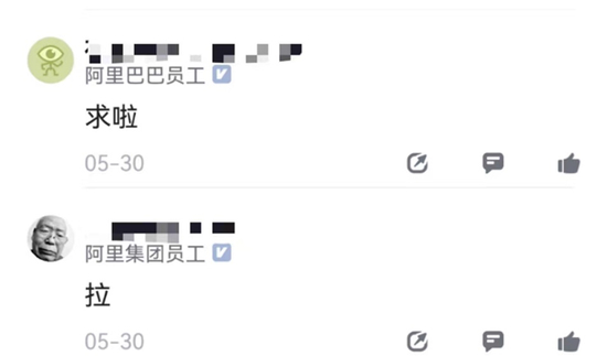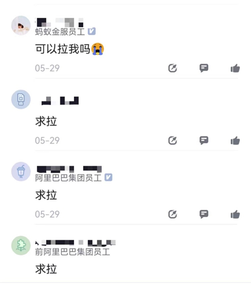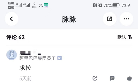 脉脉上一条“有没有阿里毕业群”的职言下,60余条的评论基本都是“求拉”,其中,大部分评论者认证为阿里巴巴员工。还有员工发文吐槽“这种温水煮青蛙式的裁员很影响状态,留下来的人也人心惶惶无心干活”。