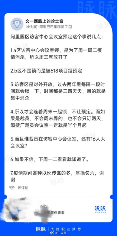针对上述爆料,另一阿里员工当天在脉脉发布长文回应称,A区访客中心会议室被锁是为了疫情消杀,B区是被618项目组预定,访客区是对外开放的,过去两年里每隔一段时间就会因集中消杀而封锁,时间都是三四天。