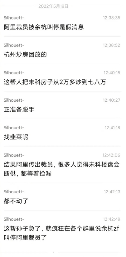 这般异常也引发了外界诸多猜测。5月18日,一则微信聊天记录截图在微博流传,据截图显示,有网友称“阿里这周因为裁员,影响太大,面比较广,被余杭叫停了,要求先申请,裁员报备。”5月19日,另一网友出来“辟谣”,其称“阿里裁员被余杭叫停是假消息,杭州炒房团放的。”
