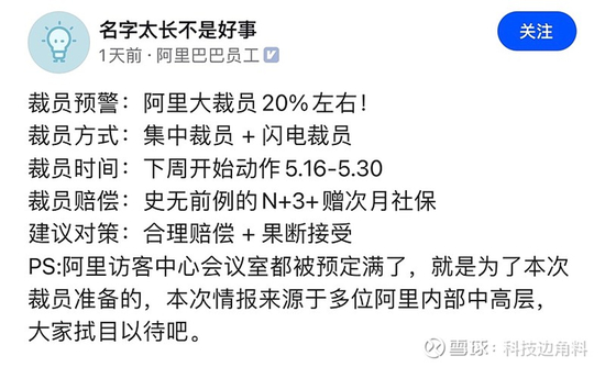 随后,认证为阿里巴巴员工的一名脉脉用户发布“裁员预警”,其称阿里将大裁员20%左右,裁员赔偿是史无前例的N+3并赠次月社保。该员工也透露,“阿里访客中心的会议室都被预定满了,就是为了本次裁员准备的,本次情报来源于多位阿里内部中高层。”