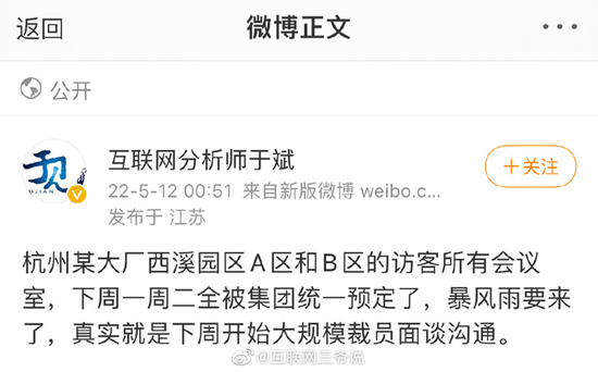 5月中旬,随着一张截图的流传,“阿里裁员”引发关注。该截图显示,有网民爆料杭州某大厂西溪园区A区和B区访客会议室被集团预定,用于大规模裁员面谈沟通。