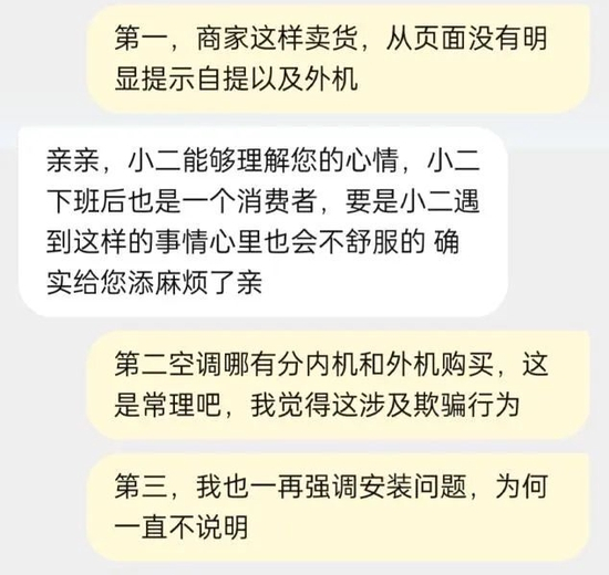 然而,下单后空调却迟迟不发货。肖先生向客服反馈情况后,才得知原来自己购买的其中3台空调是促销款,不包含外机,且需要到郑州的仓库自提。