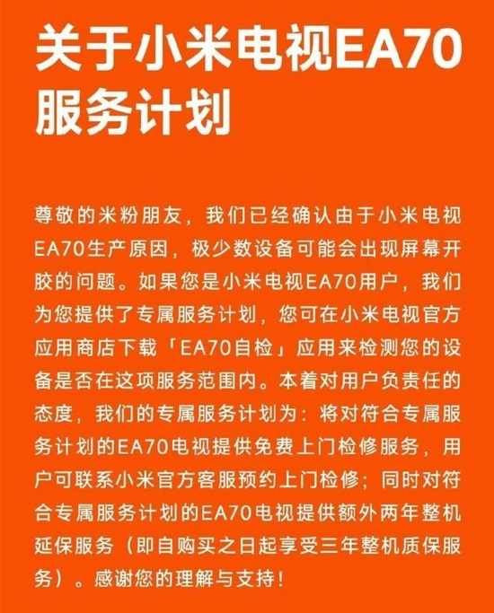 6月1日,也就是登上热搜后的第二天,小米推出了“关于小米电视EA70服务计划”,确认由于小米电视EA70的生产原因,极少数设备可能会出现屏幕开胶的问题。受影响设备锁定在生产日期为2月14日-3月20日期间的两批次产品。