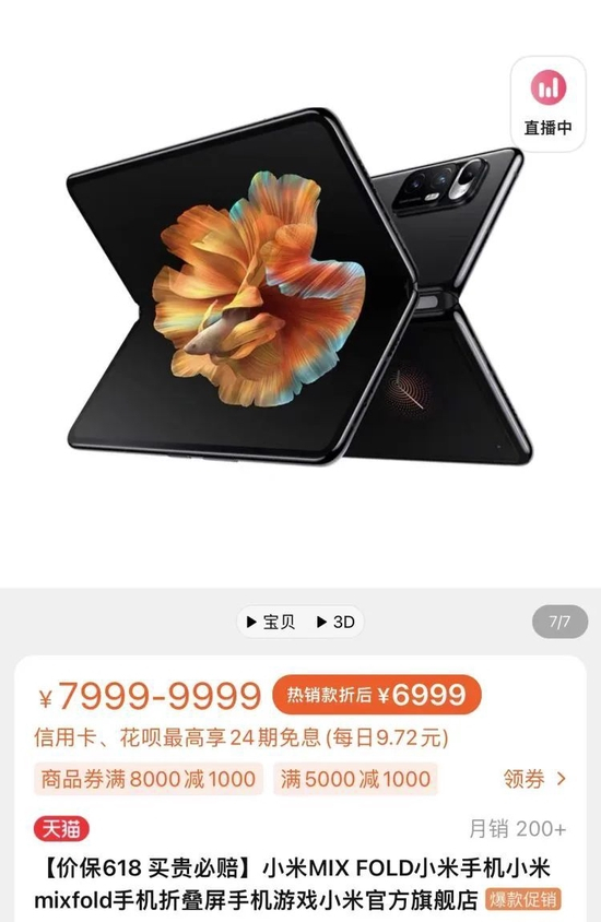 代表小米最高水平的小米MIX FOLD折叠屏手机销量不佳,售价已经比始发价9999元下降了3000多元。侧面来看,小米是否对自己的产品没有信心?/天猫小米官方旗舰店