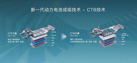 CTB,Cell To Body,和CTC技术类似,都是将电芯直接集成在底盘里。但区别也很明显,CTC会对电池包进行特定保护,而比亚迪的CTB则利用刀片电池的结构强度,将电芯融合进了车身的整体设计中来。