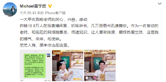 新东方英语名师董宇辉6月13日发微博表示:“一大早收到俞老师的关心,兴奋,感动。昨晚10.8万人在我直播间里,听我讲书,几万册图书迅速售空。作为一名曾经的老师,和现在的网络销售员,传递知识,让人喜欢阅读,最终热爱生活,这是我的福气,荣幸,和使命。茫茫人海,原来你也在这里。”