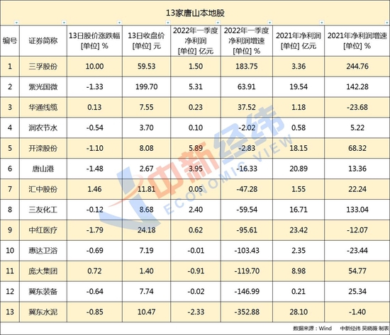 13日早盘,Wind数据显示,注册地为唐山地区的13只股票中有12只股票低开,仅三孚股份一只股票高开。