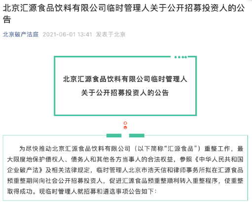 同年6月,北京破产法庭发布了一则公告,对汇源食品启动预重整,而北京汇源食品饮料有限公司是汇源果汁旗下的核心资产,也是汇源果汁的运营方。