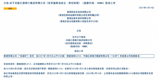 2021年1月,由于没有达到港交所函件的复牌条件,汇源果汁复牌无果,正式退市。