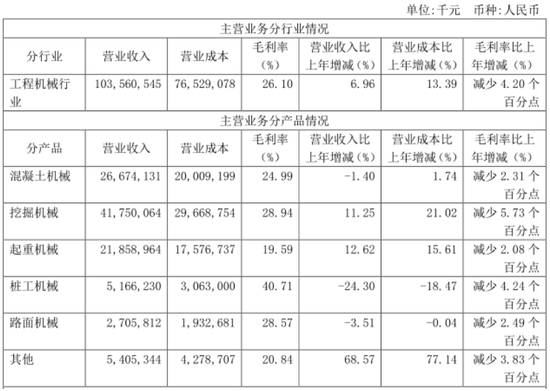 混凝土机械营收为71.1亿元,同比增长24%,混凝土泵车在68个国家市场份额第一;起重机械营收为40.9亿元,同比增长137%,汽车起重机15个国家市场份额第一;桩工机械等其他产品实现营收29.5亿元,同比增长121%,履带起重机12个国家市场份额第一。