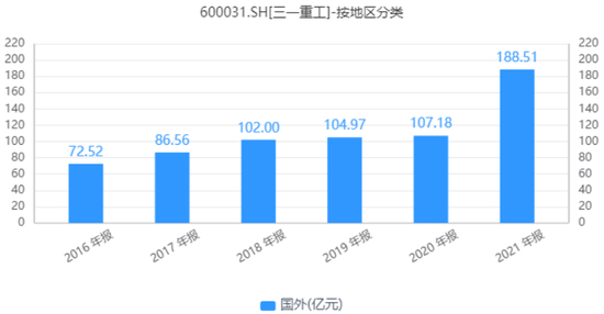 与此同时,三一重工一直将全球化布局作为公司发展的战略重点。自2016年以来,三一重工海外收入一直在稳步提升。数据显示,2016年-2021年,三一重工海外销售收入由72.52亿元增长至188.51亿元,2021年同比增速明显提升。