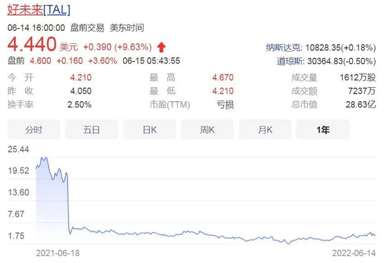 截至14日美股收盘,好未来市值为28.63亿美元,不及巅峰时的5%,然而,较低点已上涨近2倍。