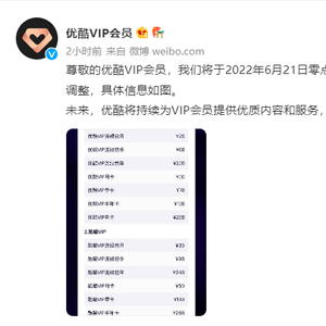 6月15日,优酷VIP会员官方微博发布通知称,将于2022年6月21日零点对优酷VIP和酷喵VIP会员价格进行调整。