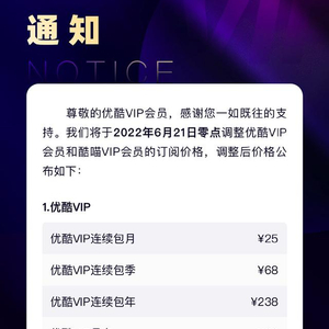 优酷表示,凡在2022年6月21日零点前已是优酷VIP或酷喵VIP自动续费状态的用户,若不更改当前自动续费状态,将享有调整前的续费价格至2023年6月20日23点59分。