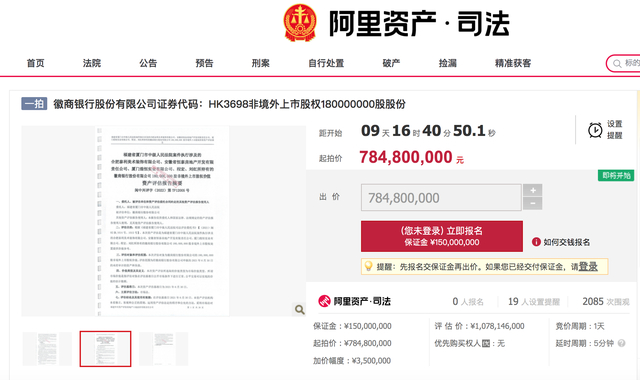 6月17日,澎湃新闻从司法拍卖平台获悉,由安徽省恒泰房地产开发有限责任公司(简称“恒泰地产”)等关联企业所持的徽商银行(03698.HK)非境外上市股权1.8亿股将于6月27日公开拍卖,起拍价格7.848亿元,折合每股起拍价约4.36元。
