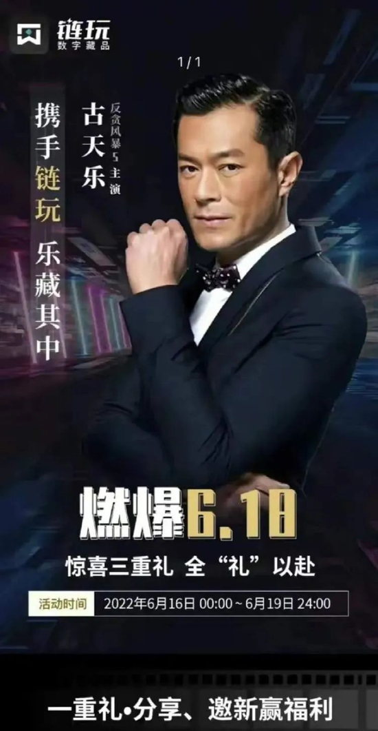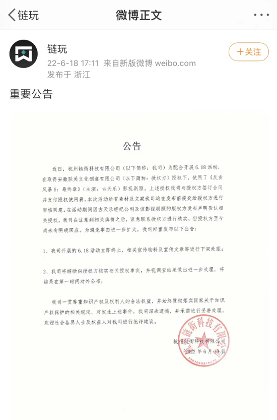 6月18日晚间,@链玩 发布公告称,近日,为配合开展6.18活动,在取得安徵联美文化创意有限公司授权下,使用了《反贪风暴5:最终章》(主演:古天乐)影视剧照。