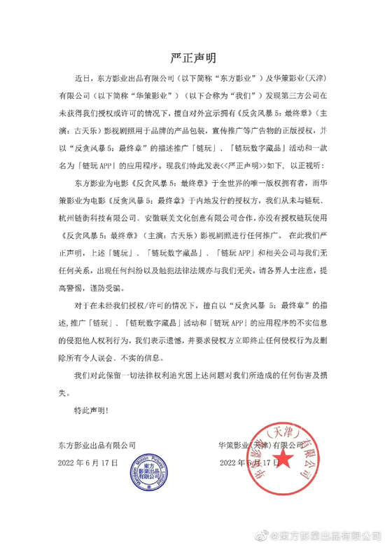 东方影业为电影《反贪风暴5:最终章》于全世界的唯一版权拥有者,而华策影业为电影《反贪风暴5:最终章》于内地发行的授权方,从未与链玩、杭州链街科技有限公司、安徽联美文化创意有限公司合作,亦没有授权链玩使用《反贪风暴5:最终章》(主演:古天乐)影视剧照进行任何推广。