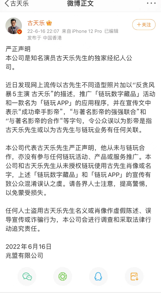 在6月16日晚间,演员古天乐个人已经微博发声明称,自己从未与链玩合作,亦没有参与任何链玩活动、产品或服务推广。古天乐经纪人公司——兆盟有限公司(下称“兆盟”)和古天乐从末授权链玩使用古天乐肖像或名字,“链玩数宇藏品”和“链玩APP”的宣传有致公众混淆误认之虞。请各界人士注意,提高警惕,以免蒙受损失。