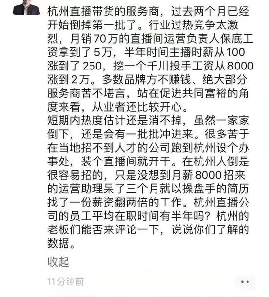 至于薪资虚高的问题,2021年杭州涌入了很多创业公司,一时间供小于求,水涨船高是正常的。今年以来,大量靠谱服务商、品牌商云集,小公司不断倒闭,也就慢慢形成了良性循环。现在的主播更多靠的是低底薪+高提成。