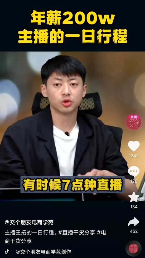 事实上,即使不算达人型主播,高薪也一直是带货主播的外部印象之一。以交个朋友为例,主播王拓今天(6月20日)在“交个朋友电商学苑”自曝年薪高达200万元。