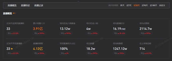 因为一边直播带货,一边秀英语、讲文史,董宇辉吸引了大批网友的关注,让“东方甄选”直播间的热度飙升。据新抖数据(新榜旗下抖音数据平台 xd.newrank.cn)统计,近30天,“东方甄选”涨粉1587万,累计观看人次1.97亿,累计销售额4.12亿元。