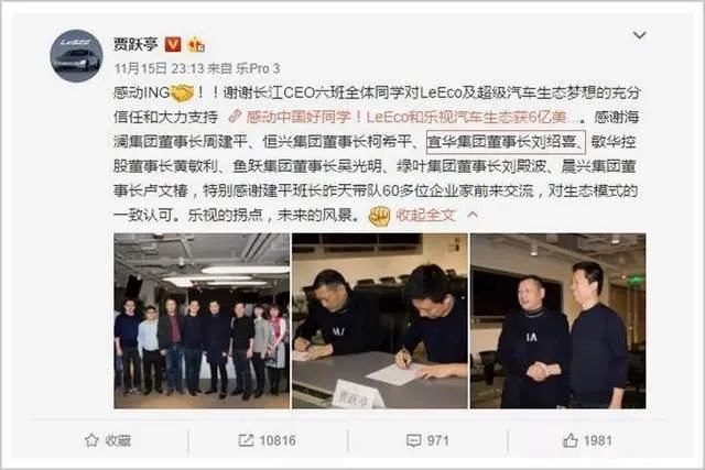 令人没想到的是,2016年,他遇人不淑,被同为长江商学院学员的贾跃亭忽悠,砸了6亿美元给乐视。
