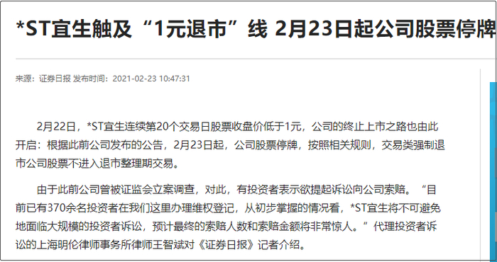 2021年3月,*ST宜华生活成为沪市“1元退市第一股”。