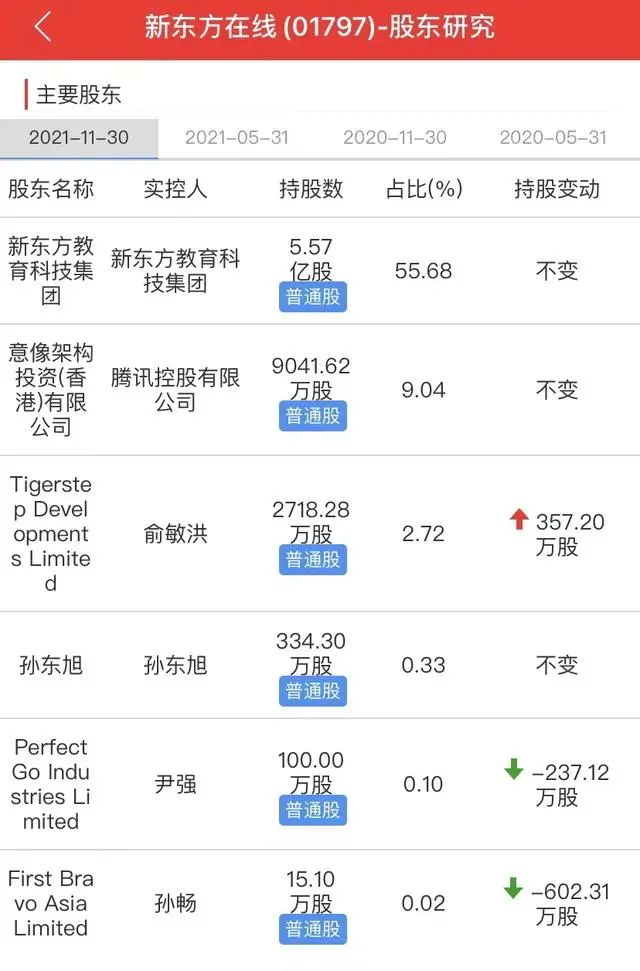 6月20日,港交所披露文件显示,腾讯控股于6月15日至6月16日,出售了新东方在线7460万股。本轮减持后,腾讯控股对新东方在线的持股比例,从9.04%降至1.58%。