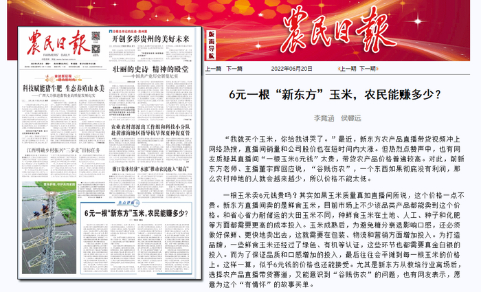 《农民日报》评论称:其实如果玉米质量真如直播间所说,这个价格一点不贵。新东方直播间卖的是鲜食玉米,目前市场上不少该品类产品都能卖到这个价格。和省心省力耐储运的大田玉米不同,种鲜食玉米在土地、人工、种子和化肥等方面都需要更高的成本投入。玉米成熟后,为避免糖分衰退影响口感,还必须做好保鲜、更快地卖出去,这就需要在包装、物流和营销方面增加投入。为打造品牌,一些鲜食玉米还经过了绿色、有机等认证,这些环节也都需要真金白银的投入。而为了保证品质和口感增加的投入,最后往往会平摊到每一根玉米的价格上。这样一算,似乎6元钱的价格也还能接受。