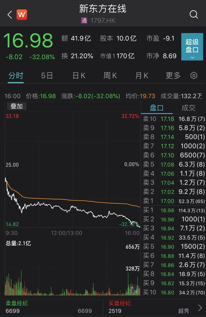 6月20日,新东方在线大幅收跌32%,报16.98港元/股,此前连续九个交易日累计大涨超680%。